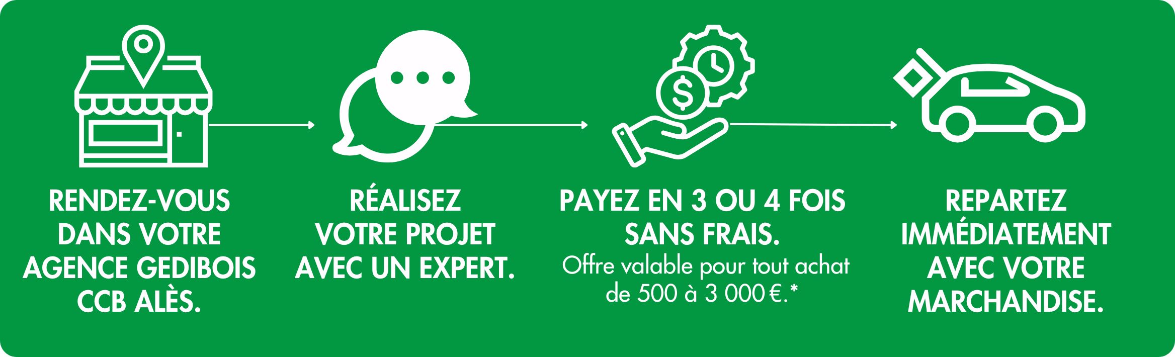Donnez vie à vos projets, réglez en toute tranquillité : nous vous donnons un coup de pouce pour vous aider à concrétiser vos projets tout en maîtrisant votre budget grâce aux paiements en 3 ou 4 fois sans frais, disponible dans notre agence Gedibois Comptoir Cévenol du Bois à Alès.