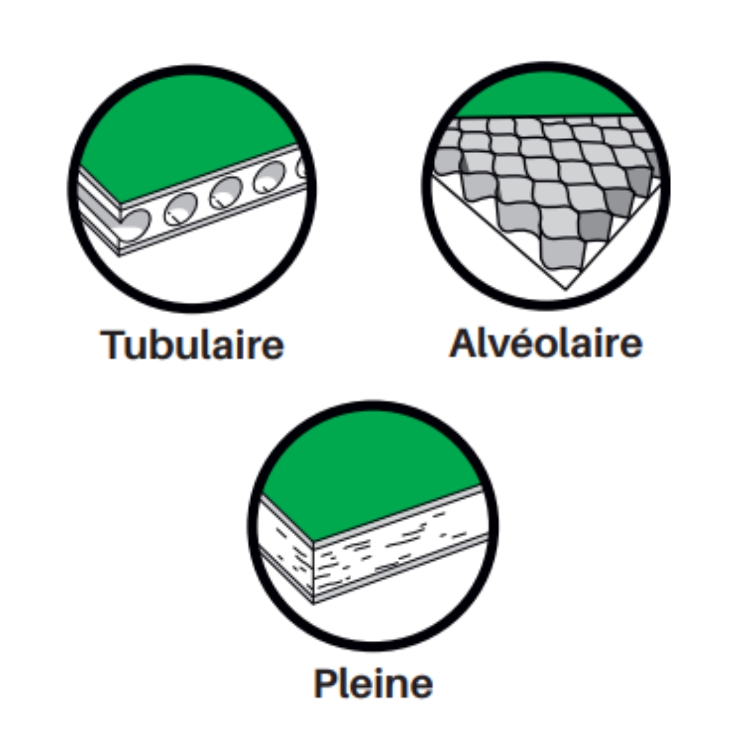 Alvéolaire : Composée d’une structure en nid d’abeilles, généralement en carton, prise en sandwich entre deux parements, garantissant légèreté et économie de matière.