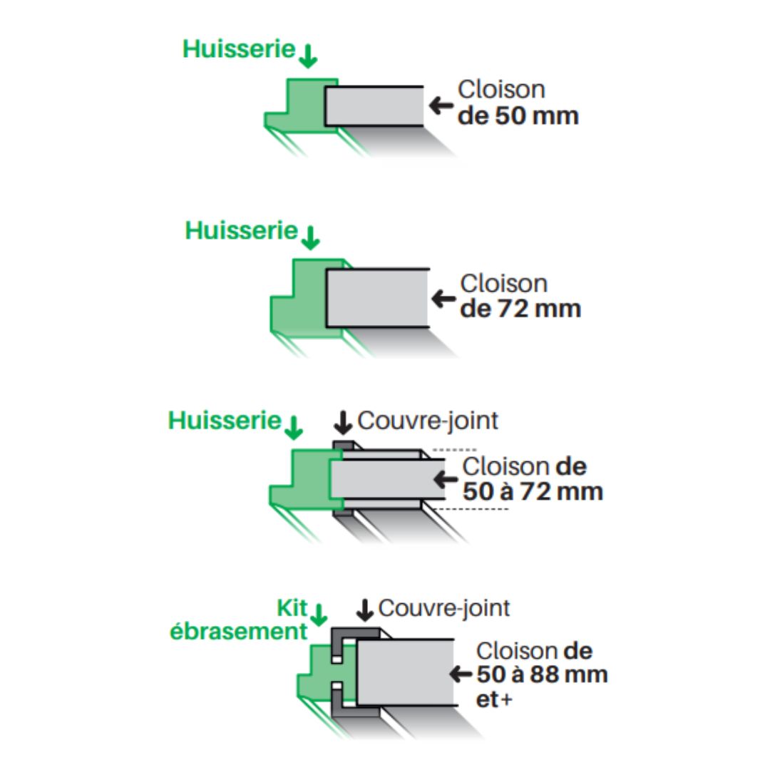 Il existe différents modèles à adapter selon la méthode de pose, l’épaisseur du mur ou de la cloison et selon la finition. Les huisseries existent en version prépeinte pour pose à l’avancement des cloisons, ou en version finie pour pose à la fin des travaux (pose fin de chantier) après réalisation des sols et des peintures.